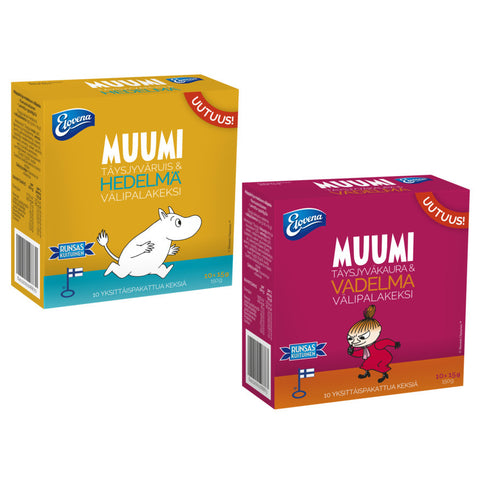 Super herkulliset Elovena Muumi täysjyväkaura ja -ruis välipalakeksit lapsille! Välipalakekseissä yhdistyy marjojen ja hedelmien herkullisuus yhdessä terveellisesten täysjyvän ja kuitujen kanssa!