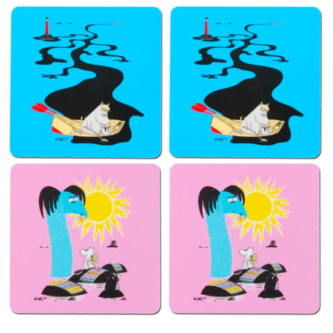 Håll Sverige Rent / Keep Sweden Tidy Moomin coasters. The set includes two pink and two blue coasters. Made in Sweden.