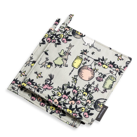 Potholder to celebrate the Tove 100 Jubilee. Includes 2 pieces. The pattern is delightfully rich in details and features many of the inhabitants of the Moominvalley. The stylish soft colours makes this something very special. Colour grey/peach. Size 22 x 22 cm.