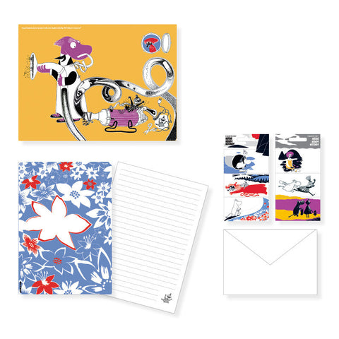 Brevpapperset, Hur gick det sen. Förtjusande Mumin brevpapperset, innehåller 2 dekaler, 20 st. A5 illustrerade brevpapper, 10 st. C6 vita kuvert. Packade i kartong. Skriv dina brev med stil på det fina Mumin brevpappret.