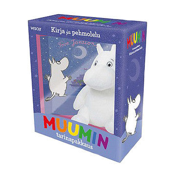 Pakkaus sisältää Muumin kuutamoseikkailu -kirjan ja Muumi-pehmolelun, jonka korkeus on 13 cm.