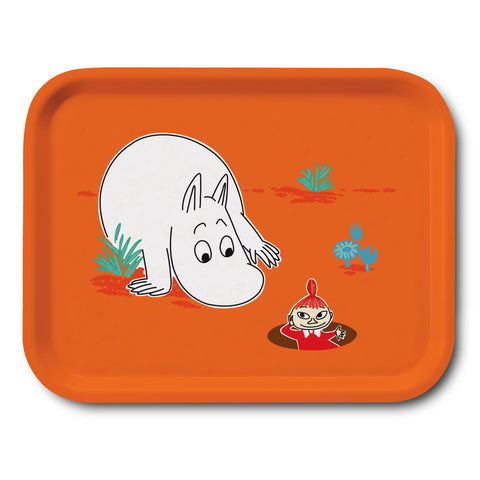 Orange tray featuring Moomintroll and Little My. It’s handmade with a classic motif taken from Tove Jansson's original drawings. High quality wood, made in Sweden. Suitable for dishwasher.