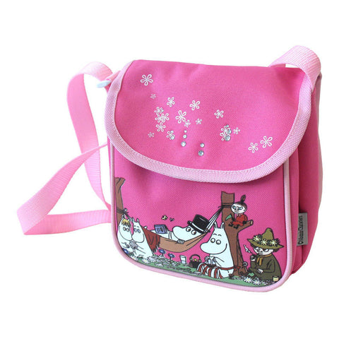A pretty pink shoulder bag featuring Moomin characters. The bag has a long adjustable shoulder strap and the flap fastens with a velcro pad. Size 20x19x10cm. Make the bright pink bag a part of your outfit!