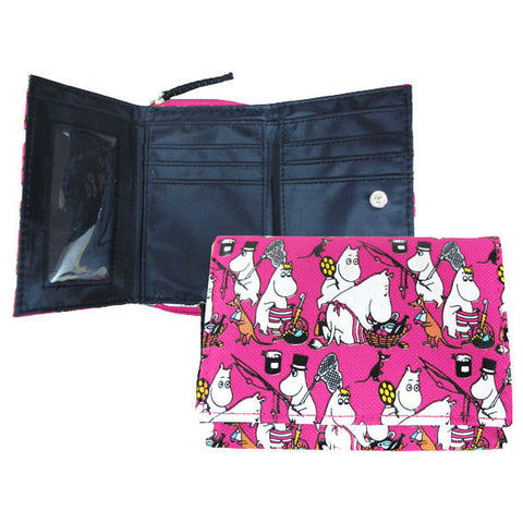 Lovely pink Moomin wallet with a coin-pocket with a zipper. Closed with a snap fastener, includes 6 card-pockets, 1 open pocket, 1 transparent pocket and one pocket for bills. Featuring beloved characters from Moominvalley.