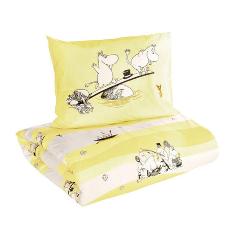 Bed linen set with the Moomin family spending time by the sea. Sunny yellow sheets that will make you smile about all the summer memories spent by the water. Jump in and enjoy your time with the Moomin family at the beach. The Moomin-duvet- and pillow covers are inspired by Tove Jansson’s original drawings and are authentic ©Moomin Characters™ licensed products.