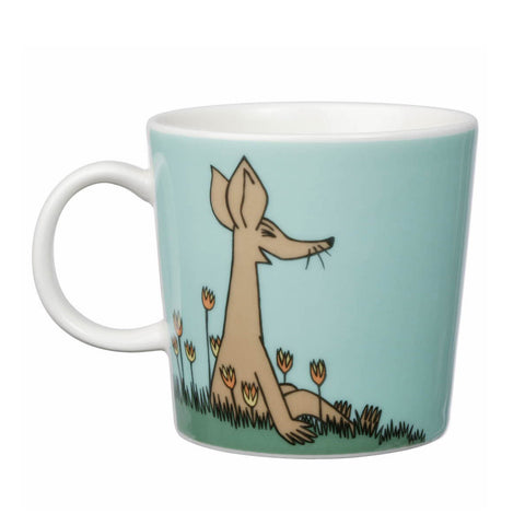 This light blue/turquoise Moomin mug by Arabia from 2008 features the always anxious Sniff sitting on grass and holding a cat. It's wonderfully illustrated by Arabia artist Tove Slotte-Elevant. Complete your collection of Moomin mugs with this beautiful piece. Also see the other parts of the Sniff series.