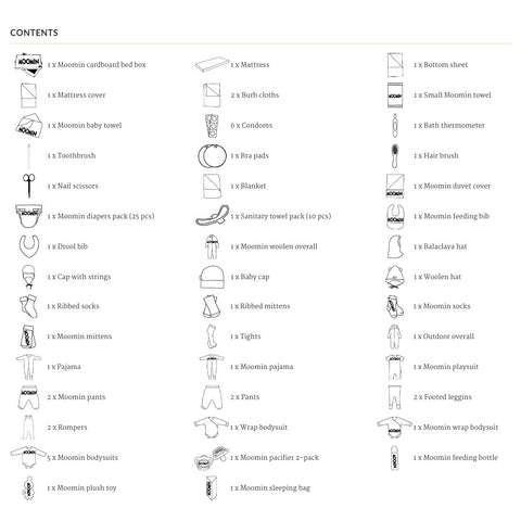 Moomin Edition Finnish Baby Box contains a unique mix of high quality Scandinavian design and official Moomin baby clothes and products, many of which are not available anywhere else. The Moomin Edition Finnish Baby Box includes necessities to help you dress and take care of your newborn for the first 9 months.